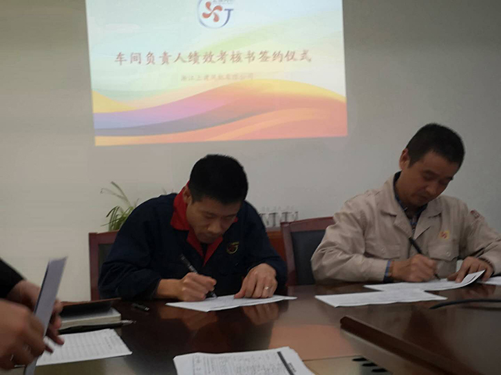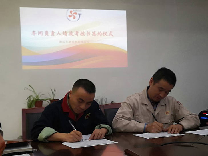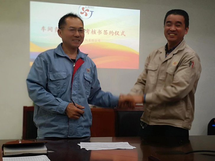 簽訂儀式后童總提出了3點要求:一、績效考核要杜絕感情因素、做到公平公正、更不能流于形式;二、各車間主任要時刻保持學習的心態(tài),學習先進的加工設備與工藝,學習提高產(chǎn)能、6S現(xiàn)場的先進管理方式,培養(yǎng)一大批一專多能的復合式制造人才;三、深耕風機產(chǎn)業(yè),堅持不懈地服務營銷、堅守制造優(yōu)質風機裝備的那份初心。