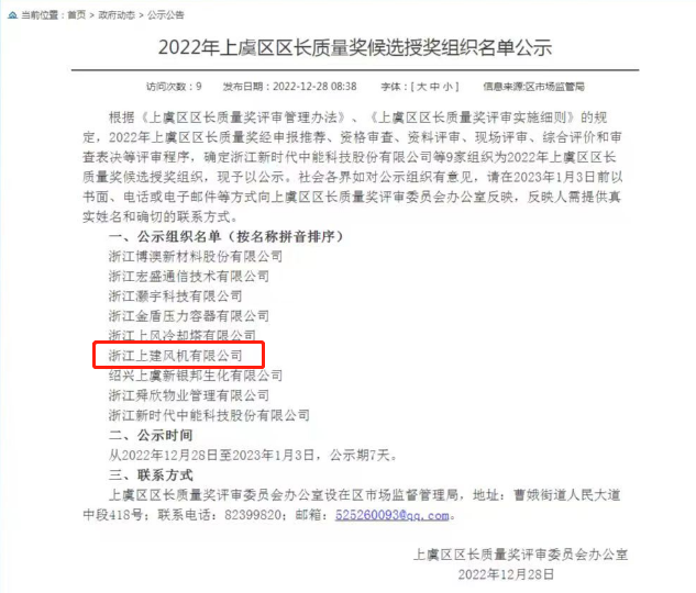 2022年12月,2022年上虞區(qū)區(qū)長(zhǎng)質(zhì)量獎(jiǎng)候選授獎(jiǎng)企業(yè)名單公示結(jié)果顯示,上建風(fēng)機(jī)榮登榜單,獲得2022年上虞區(qū)區(qū)長(zhǎng)質(zhì)量獎(jiǎng)候選授獎(jiǎng)。