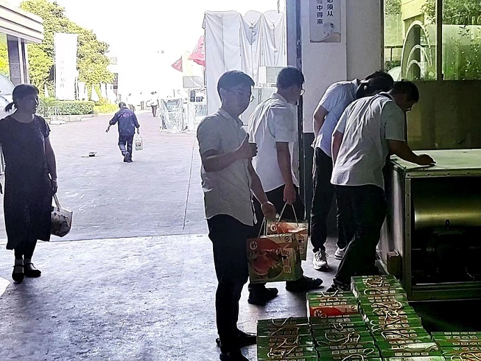 一個(gè)個(gè)芳香四溢、晶瑩圓潤的桃子,被仔細(xì)地放在盒子里。每位員工都可領(lǐng)取一盒,每一盒都彰示著公司對忠誠奉獻(xiàn)上建人的滿滿心意與愛意。