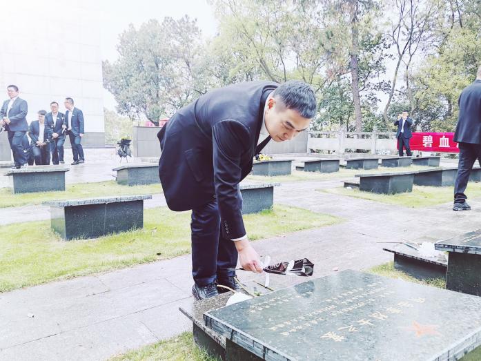 最后,董事長(zhǎng)童海標(biāo)先生和行政管理人員緩步繞行,瞻仰革命烈士紀(jì)念碑,并向各位在此長(zhǎng)眠的英雄們獻(xiàn)上菊花,一塊塊墓碑陳列在此,無(wú)聲講述著中華民族近代以來(lái)激昂豪邁、波瀾壯闊的奮斗歷程。黑色的墓志銘彰顯中國(guó)人民百折不撓,自強(qiáng)不息的偉大精神。